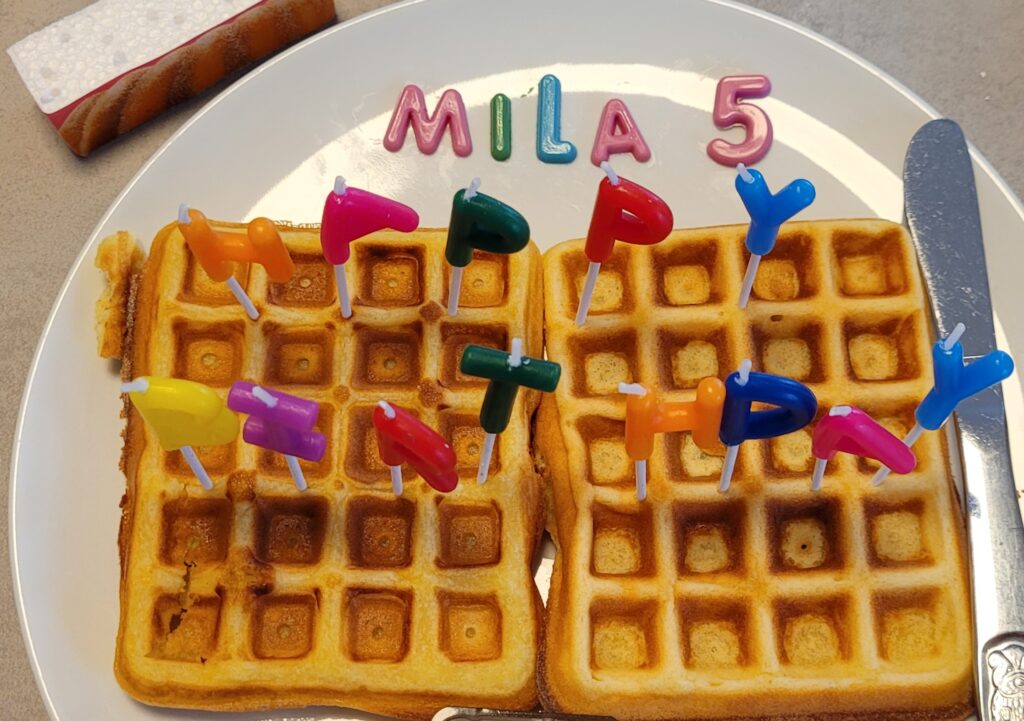 Den Teig in 5 Portionen teilen und auf ein Backblech mit Backpapier legen. Es ist ganz wichtig, dass der Teig nicht zu sehr gedrückt wird, damit er luftig bleibt.